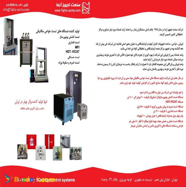 شرکت صنعت تجهیز آزما با سابقه بیش از دو دهه، سازنده و فروشنده دستگاه های خواص مکانیکی مواد و ابزار کنترل کیفی و از جمله دستگاه های تست کشش یونیورسال از ظرفیت 1 کیلونیوتن تا 200 تن، جهت استفاده از آزمون کشش، فشار، خمش، Stress Relaxation،ضریب اصطکاک، برش، چسبندگی و ..... مناسب برای تست نمونه در صنایع سلولزی،پلیمری، نساجی، چرم، کاغذ و کارتن، سیم و کابل، میلگرد و ... کیفیت و کارایی بالا، قیمت مناسب و خدمات پس از فروش فوق العاده شرکت ارزشی افزوده برای شرکت *صنعت تجهیز آزما* میباشد .
