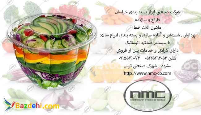 شرکت صنعتی ابزار بسته بندی خراسان طراح و سازنده ماشین آلات خط فرآوری , آماده سازی و بسته بندی سالاد با ظرفيت هاي متفاوت : تناژ بالا , نرمال , کارگاهی سیستم عملکرد : تمام اتوماتیک – نیمه اتوماتیک طرح ماشین آلات : همگی از استیل و یا آلیاژ مقاوم به آب و اسید اجراي كار با كيفيت صادراتی و استيل هاي 304 و قطعات آهني با پوشش مقاوم اپوكسي مي باشد دارای پیشینه در ضمینه صادرات ماشین آلات فوق به کشورهای دیگر دارای 18 ماه گارانتی و 10 سال خدمات پس از فروش دارای استاندارد رسمی ایران ، استاندارد CE اروپا و همچنین گواهی iso9001-2008 جهت دریافت اطلاعات کاملتر و ارسال مخشصات کامل از دستگاه به سایت http://www.nmc-co.com درخواست کامل خود را در پنل ارتباط با ما وارد نمایید تلفن جهت مشاوره تلفنی : 4-05135413053 و 09155140073 فروش پايان معامله نيست آغاز يک تعهد است آدرس ما در اینستاگرام : https://www.instagram.com/nesari__nmc آدرس ما در آپارات : http://www.aparat.com/NMCCO