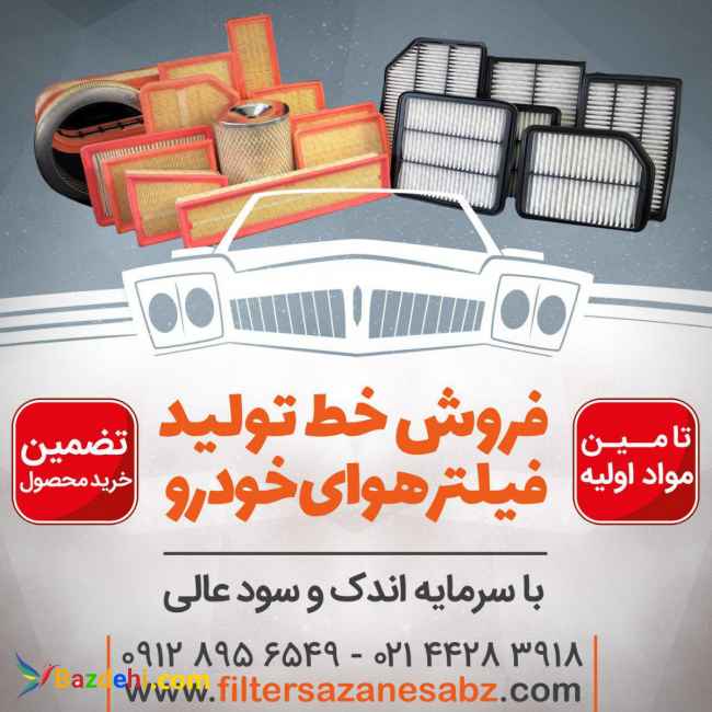 فروش دستگاه های تولید فیلتر هوای اتومبیل با شرایط ویژه در سراسر کشور ✅توليد قطعات خودرو ؛ شغل پر درآمد ، مستقل ، زود بازده و مطمئن ✅فراخوان جذب توليد كننده (تمام استان هاي كشور) ?حداقل ماهانه 10 میلیون سود خالص ?بازگشت سرمایه ظرف ۶ماه ? فیلتر سازان سبز ?تامين مواد اوليه و تضمين خريد از ما ?توليد و مونتاژ محصول بصورت دستمزدي با شما ✅شماره های تماس ? 02144283918 02144283905 09387173142 09128956549