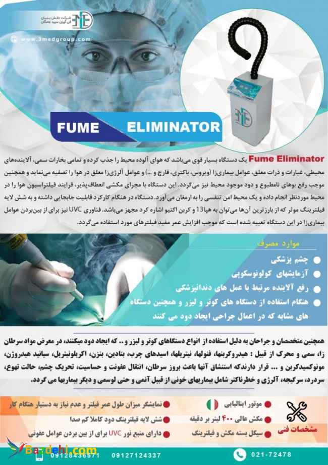 Fume Eliminator یک دستگاه بسیار قوی می باشد که هوای آلوده محیط را جذب کرده و تمامی بخارات سمی ،آلاینده های محیطی،غبارات و ذرات معلق ، عوامل بیماری زا (ویروس،باکتری،قارچ و ...) و عوامل آلرژی زا معلق در هوا را تصفیه می نماید و همچنین موجب رفع بوهای نامطبوع و دود موجود محیط نیز می گردد . این دستگاه با مجرای مکشی انعطاف پذیر،فرایند فیلتراسیون هوا را در محیط مورد نظر انجام داده و یک محیط امن تنفسی را به ارمغان می آورد . دستگاه در هنگام کارکرد قابلیت جا به جایی داشته و به شش لایه فیلترینگ موثر که از بارزترین آن ها می توان به هپا13 و کربن اکتیو اشاره کرد مجهز می باشد . فناوری UVC نیز برای از بین بردن عوامل بیماری زا در این دستگاه تعبیه شده است که موجب افزایش عمر مفید فیلترهای مورد استفاده می گردد. موارد مصرف • چشم پزشکی • آزمایشگاه های کولونوسکوپی • رفع آلاینده مرتبط با عمل های دندانپزشکی • هنگام استفاده از دستگاه های کوتر و لیزر و همچنین دستگاه های مشابه که در اعمال جراحی ایجاد دود می کنند. همچنین متخصصان و جراحان به دلیل استفاده از انواع دستگاه های کوتر و لیزر و.. که ایجاد دود می کنند ، در معرض مواد سرطان زا ، سمی و محرک از قبیل :هیدروکربنها ، فنولها ، نیتریلها ، اسیدهای چرب ، بتادین ، بنزن ، اکریلونیتریل ، سیانید هیدروژن ، مونوکسیدکربن و ... قرار دارند که استنشاق آنها باعث بروز سرطان ، انتقال عفونت و حساسیت ، تحریک چشم ، حالت تهوع ، سردرد ، سرگیجه ، آلرژی و خطرناکتر شامل بیماریهای خونی از قبیل آنمی و حتی لوسمی و دیگر بیماریها می گردد .