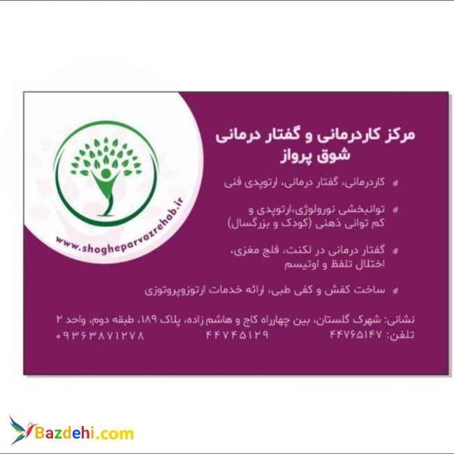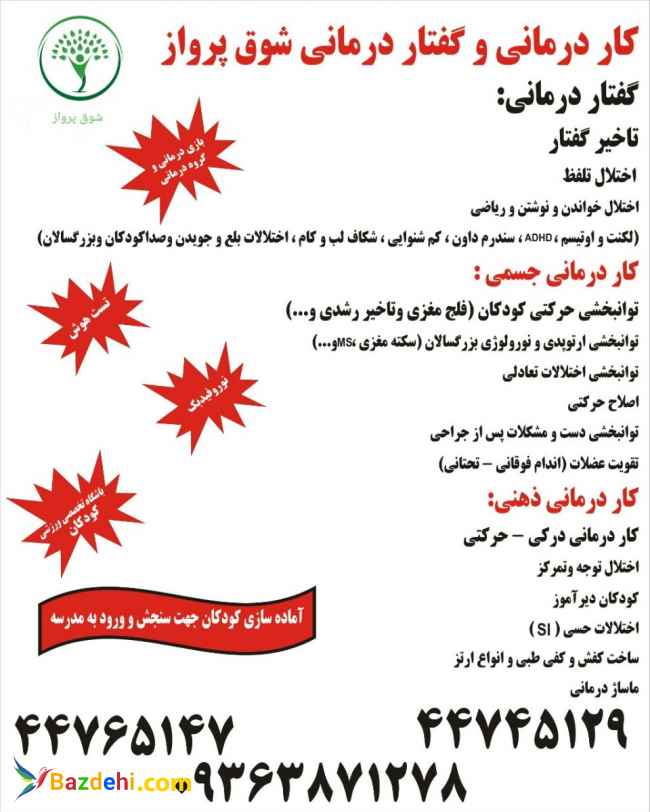 ارائه کلیه خدمات کاردرمانی جسمی کودکان(فلج مغزی.هیدروسفالی.میکروسفالی.ارب پالسی.تاخیر حرکتی.آسیب مغزی و مشکلات تعادلی و...)و بزرگسالان سکته مغزی.ام اس.پارکینسون.آسیب نخاعی.ضربه مغزی.مشکلات تعادلی و مخچه و...