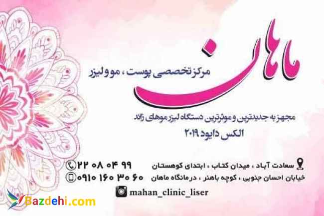 سعادت آباد میدان کتاب ابتدای خ کوهستان خ احسان جنوبی درمانگاه ماهان طبقه اول کلینیک لیزرماهان