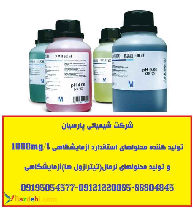 شرکت شیمیائی و صنعتی پارسیان تولید کننده محلولهای تست شیمیائی آب،خاک و پسابهای صنعتی معرفهاي آزمايشگاهي و محلولهاي استاندارد (LABORATORY CHEMICAL REAGENTS) رديف نام محصول Product name 1 محلول پتاسيم كلرايد 3 مولار KCl 3 mol/l 2 محلول پتاسيم كلرايد / نقره كلرايد 3 مولار KCl/AgCl 3 mol/l 3 محلول E.B.T (معرف تست سختي كل آب) Eriochrome Black T 4 محلول E.D.T.A )تتراپلکس3) (محلول تيتراسيون تست سختي كل آب) E.D.T.A(2Na)0.1N 5 محلول O.T.O (ارتوتوليدين) (محلول تست كلر آزاد در آب) Ortho Tolidine Hydrochloride 6 بافر PH=10 (مخصوص تست سختي كل آب) Buffer Hardness PH=10 7 محلول فنل رد (مخصوص تست PH آب) Phenol Red solution 8 محلول متيل رد Methyl Red Solution 9 مصرف نسلر( تست آمونياك در آب) Nessler's Reagent 10 محلول فهيلنگ A, B Fehling Solution A&B 11 معرف بيورت Biuret Reagent 12 معرف كارز (I , II) Carrez Reagent 13 محلول لوگل Lugol's Solution 14 محلول ويجس Wijs , Solution 15 معرف هانوس Hanus Reagent 16 محلول فروئين (مخصوص تست يون آهن در آب) Ferroin Solution 17 محلول لاكتو فنل كاتن بلو Lacto Phenol Cotton Blue sol. 18 محلول اكسيژن صفر (مخصوص نگهداري الكترود اكسيژن) Zero Oxygen Sol. 19 محلول پركننده الكترود اكسيژن D.O Electrode’s Filling Solution 20 معرف متيل اورانژ Methyl Orange 21 معرف بندیکت Benedict’s reagent   رديف نام محصول Product name 22 محلول اچینگ نایتال1% و 2% NITAL ETCHING SOL. 23 محلول اچینگ نایتال 10%و 5% NITAL ETCHING SOL. 24 محلول اچینگ نایتال 15% NITAL ETCHING SOL. 25 بافر فرمادئید PH=7 FORMALDEHYDE BUFFER PH=7 26 محلول گاورز GOWERS SOL.(RBC) 27 محلول تیتراسیون نیترات نقره0.0282 normal 1ml=1mg Cl SILVER NITRATE 0.0282 NORMAL 28 محلول متیلن بلو آلکالی(محلول لوفلر) LOFFLERS METHYLENE BLUE 29 محلول وینکلر شماره 1 (مخصوص تست اکسیژن محلول در آب) WINKLER´S SOL. NO:1 30 محلول وینکلر شماره 2 (مخصوص تست اکسیژن محلول در آب) WINKLER´S SOL. NO:2 31 محلول رنگ گیمسا GIEMSA STAIN SOLUTION 32 محلول فرمالین سالین FORMALIN-SALINE SOLUTION 33 محلول رنگ کریستال ویولت اگزالات CRYSTAL VIOLET OXALATE SOL. 34 پودر رینگر RINGER POWDER 35 محلول کینیون کربول فوشین KINYOUN CARBOL FUCHSIN 36 معرف تست C.O.D COD REAGENT 37 محلول رنگ کارمین CARMIN STOCK SOLUTION 38 محلول تترامتیل بنزیدین T.M.B 39 گلیسرین ژله ای)گلیسرین ژلاتین) JELLY GLYCERINE 40 بافر تریس PH=7.6 TRIS BUFFER PH=7.6 41 بافر تریس PH=8.0 TRIS BUFFER PH=8 42 معرف کالکون( تست کلسیم در آب) CALCON REAGENT POWDER 43 محلول رنگ متیلن بلو METHYLENE BLUE SOLUTION 44 نایسر متیلن بلو NEISSER´S METHYLENE BLUE 45 معرف زیمرمان راینهارد ZIMMERMAN –RAINHARDT 46 محلول اندیکاتور فنل فتالئین 1% PHENOLPHTHALEIN 47 محلول تتراپلکس A TITRIPLEX A SOLUTION 48 محلول تتراپلکس B TITRIPLEX B SOL. 49 بافر استون(فیکساتیو) ACETON BUFFERD (FIXATIVE) 50 معرف پتاسیم دی کرومات0.250N (مخصوص تست C.O.D) POTASSIUM DICHROMATE 51 معرف آمونیوم ایرون سولفات 0.250N (مخصوص تست C.O.D) AMMONIUM IRON SULFATE(II)-REAGENT FOR COD 52 محلول پتاسیم هیدروکساید در گلیسرین GLYCEROL-POTASSIUM HYDROXIDE 53 محلول پتاسیم کرومات 5% (مخصوص تست کلراید)تیتراسیون ارژانتومتریک POTASSIUM DICHROMATE 5% 54 معرف یداید آزاید قلیائی (مخصوص تست اکسیژن در آب) ALKALINE IODIDE AZIDE REAGENT 55 معرف بروسین سولفات BRUCINE SULFATE REAGENT 56 معرف اسپادنس SPADNS REAGENT 57 معرف مولیبدو وانادات(مخصوص تست فسفات) MOLYBDOVANADATE REAGENT SOLUTION 58 معرف پان(محلول) PAN INDICATOR SOLUTION 59 معرف آلومینون(محلول) ALUMINON REAGENT 60 چسب سیتولوژی انتلان ENTHELLAN MOUNTING MEDIUM 61 پتاسیم تلوریت محلول 1% و 3.5% POTASSIUM TELLURITE 62 معرف فسفو تنگستیک اسید 10% PHOSPHOTUNGESTIC ACID SOLUTION 10% 63 معرف مولیش MOLISCH´S REAGENT 64 معرف کجلدال KJELDHAL INDICATOR (MIX INDICATOR) 65 معرف گریس(مخصوص تست نیتریت درآب) GRIESS REAGENT 66 معرف برادفورد BRADFORD REAGENT تولید محلولهای استاندارد هدایت سنجی(کنداکتیویتی)((CONDUCTIVITY STANDARD SOLUTION و انواع بافرهای کالیبراسیون پی اچ از PH=1.O تاPH=14.0 « در صورت نياز به محلولهاي ديگر با اين شركت تماس حاصل فرمائيد » تهران، خيابان استاد نجات‌اللهي، انتهاي خيابان سميه، كوچه پورموسي، پلاك 17، طبقه سوم، واحد 12 09195054577-09121220085-09352212621-09353903060 88804845-88924588-88924589-88802917-8