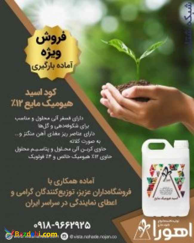شرکت ویستا نهاده نوژان با سابقه ای بیش از چهار سال در زمینه تولید و طراحی انواع کودهای ارگانیک و شیمیایی،موفق به تولید اولین کود اسید هیومیک مایع دارای NPK,و سایر ریزمغذیها مورد نیاز گیاه،از جمله آهن، روی، مس، منگنز، منیزیم و...در ایران شده،و این کود را با نازلترین قیمت و بهترین کیفیت به بازار عرضه میکند،و آماده همکاری با نمایشگاه داران و شرکتهای توزیع و تامین نهاده میباشد صنف کشاورزی دسته شغلی: تولید کننده کود شیمیایی و ارگانیک نام واحد تجاری : ویستا نهاده نوژان آگهی دهنده محمد علی کریمی استان و شهر: قم نشانی:قم شهرک صنعتی شکوهیه میدان صنعت ابتدای بلوار امام خمینی پلاک 72 تلفن ۰۲۵-۳۳۳۴۰۰۱۶ شماره همراه ۰۹۱۸۹۶۶۲۹۲۵ آدرس سایت:vistanahade.com پیج اینستاگرام:Vista.nahade.nojan.co بهترین هیومیک اسید خرید هیومیک خرید هیومیک اسید خرید هیومیک اسید پرک خرید هیومیک اسید جامد خرید هیومیک اسید مایع فروش هیومیک فروش هیومیک اسید فروش هیومیک اسید پرک فروش هیومیک مایع هیومیک اسید عالی Ph اسید هیومیک اختلاط هیومیک اسید اسید هیومیک برای گلهای اپارتمانی اسید هیومیک جنوبگان اینوست هیومیک قیمت اسید هیومیک جامد قیمت هیومیک اسید گرانوله محلول هیومیک اسید هیومیک اسید اصل هیومیک اسید پتاسیم هیومیک اسید تتاکو هیومیک توتال تلفن ۰۲۵-۳۳۳۴۰۰۱۶ شماره همراه ۰۹۱۸۹۶۶۲۹۲۵ آدرس سایت:vistanahade.com پیج اینستاگرام:Vista.nahade.nojan.co