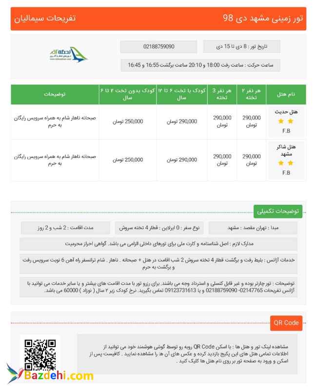 تور مشهد ویژه دی ماه ویژه رفت های 8 دی _ برگشت 11 دی رفت 9 دی _ برگشت 12 دی رفت 10 دی _ برگشت 13 دی رفت 11 دی _ برگشت 14 دی رفت 12 دی _ برگشت 15 دی ساعت رفت 18:00 و 20:10 ساعت برگشت 16:55 و 16:45 تور چارتر بوده و غیر قابل کنسلی و استرداد وجه می باشند. برای رزرو تور با مدت اقامت های بیشتر و یا سایر خدمات می توانید با آژانس تفریحات 02147765- 02188759090 و یا 09123731613 تماس بگیرید. نرخ کودک زیر ۲ سال ( نوزاد ) 60000 می باشد.