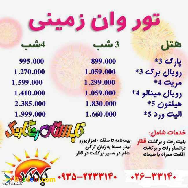 بامدادگشت البرز تور وان با قطار خدمات شامل: بلیت رفت و برگشت قطار ترنسفر رفت و برگشت اقامت همراه با صبحانه بیمه لیدر شام در مسیر برگشت قطار 4روز و 5 روز حرکت 1شنبه ها و 4شنبه ها شروع قیمت از 899.000 با ما تماس بگیرید: 026-33140 0935-2233140