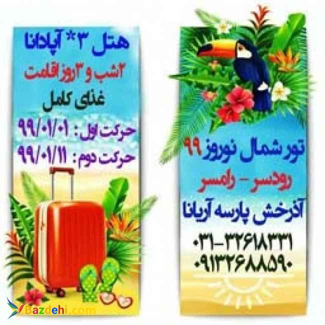 ??? انفجار ??? ??این بار مارا متفاوت همراهی کنید ☺️? ? #شمال ? ❌❌برای ثبت نام اقدام کنید ❌❌ ???????????????? حرکت اول : 99/01/01 //// 99/01/05 حرکت دوم : 99/01/11 //// 99/01/15 اتوبوس اسکانیا ⚜️ 680.000 تومان اتوبوس وی ای پی ⚜️ 750.000 تومان ? 2شب و 3 روز اقامت در هتل 3 ستاره آپادانا ?لب دریای رودسر 35 کیلومتری رامسر با بهترین و تمیز ترین و بی خطر ترین ساحل شمال ایران ?خدمات: هر خانواده دارای یک اتاق مجزا ، صبحانه سلف سرویس به همراه ناهار و شام در رستوران هتل به همراه سه گشت ، تله کابین رامسر،جنگل 3000 با سرو ناهار در جنگل و آبشار ?ورودی مکانهای دیدنی در سراسر ایران به عهده مسافر می باشد.? ?جهت هماهنگی با شماره های 09132688590-03132618331 تماس حاصل فرمایید. ? اصفهان - باغ غدیر