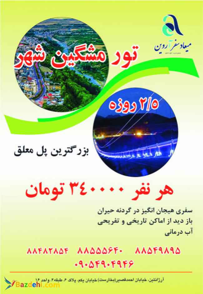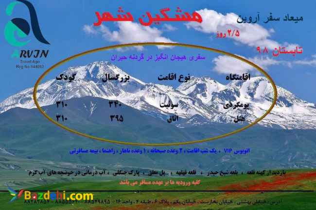 مشکین شهر 2/5 روزه زمینی با اتوبوس vip 1 شب اقامت + 2 تا صبحانه + 1 ناهار بازدید از اماکن تاریخی و تفریحی پل معلق پارک جنگلی کهنه قلعه بقعه شیخ حیدر آبگرم 02188555640 تماس 9 الی 18