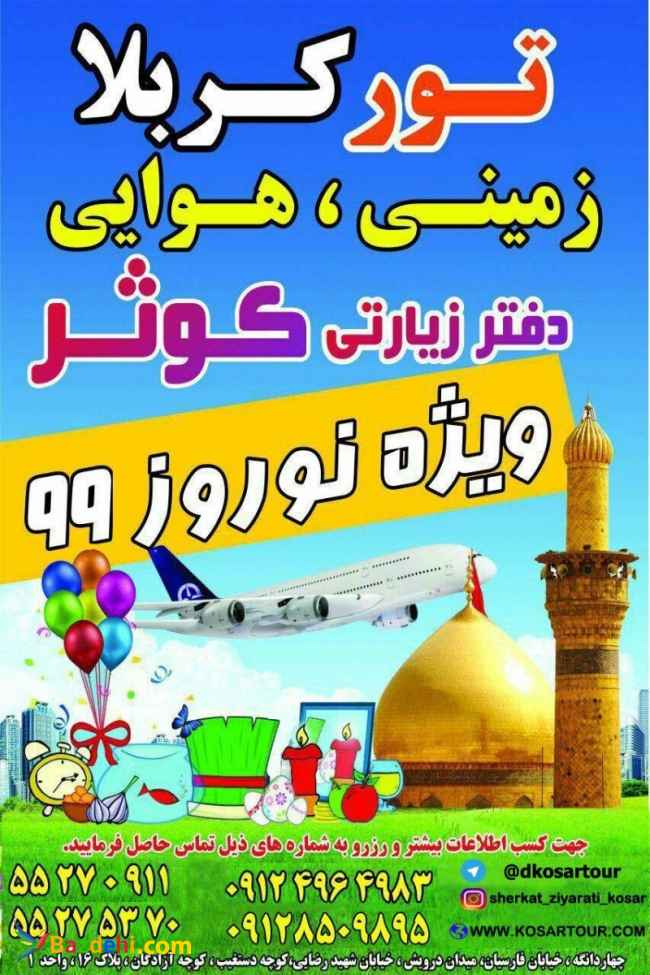 تور هوایی(7شب 8روز) دفتر زیارتی کوثر اقامتی خاطر انگیز در هتل vip در کربلا (5شب) هتل درجه الف در نجف اشرف(2شب) ترانسفر فرودگاهی گشت زیارتهای دوره صبحانه،نهار،شام همراه با سرو میوه عوارض خروج از کشور به عهده مسافر میباشد عوارض ورودی نجف به عهده مسافر میباشد استفاده از کادری مجرب در عراق همراهی مدیران و مداحان برجسته (این مجموعه کفیت را فدای کمیت نمیکند) اجرایی متفاوت و بیاد ماندنی 02155270911 02155275370. 09124964983 09128509895