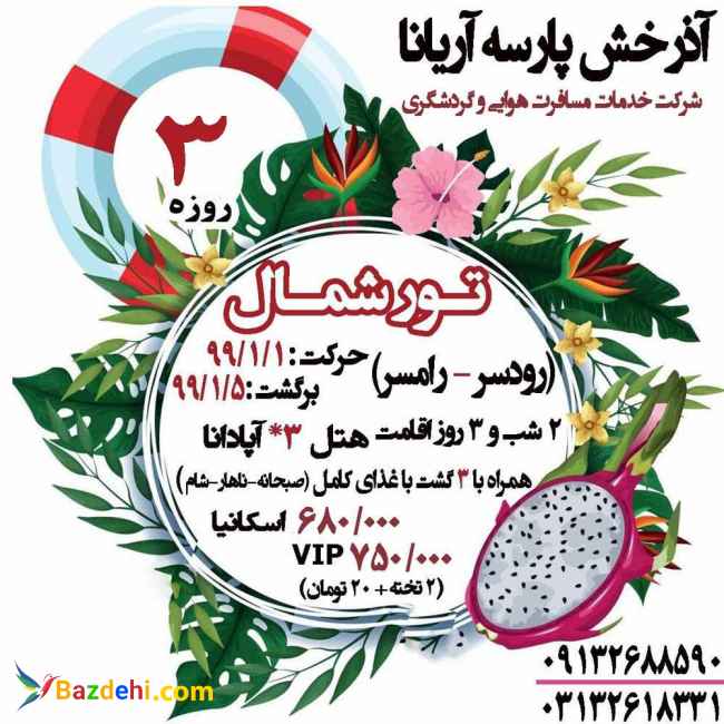 انفجار ??? انفجار ??? ??این بار مارا متفاوت همراهی کنید ☺️? ?طبیعت زیبای #شمال ? ❌❌برای ثبت نام اقدام کنید ❌❌ ???????????????? حرکت اول : 99/01/01 //// 99/01/05 حرکت دوم : 99/01/11 //// 99/01/15 اتوبوس اسکانیا ⚜️ 680.000 تومان اتوبوس وی ای پی ⚜️ 750.000 تومان ? 2شب و 3 روز اقامت در هتل 3 ستاره آپادانا ?لب دریای رودسر 35 کیلومتری رامسر با بهترین و تمیز ترین و بی خطر ترین ساحل شمال ایران ?خدمات: هر خانواده دارای یک اتاق مجزا ، صبحانه سلف سرویس به همراه ناهار و شام در رستوران هتل به همراه سه گشت ، تله کابین رامسر،جنگل 3000 با سرو ناهار در جنگل و آبشار ?ورودی مکانهای دیدنی در سراسر ایران به عهده مسافر می باشد.? ❌❌❌❌❌❌❌❌❌❌❌ ?تور زمینی وان ترکیه ویژه نوروز 99? ??همزمان با کنسرت ابی ?? ??3 شب و 4 روز اقامت ? هتل آراگل 3 ستاره تاپ ??حرکت 10فروردین ماه ❌❌❌❌❌❌❌❌❌❌❌ برای پیش فروش تورهای نوروز از الان با ما تماس بگیرید ?? سفری نوروزی با آذرخش ??#تور نوروزی مشهد مقدس 99 ?? #فروردین۹۹ #مشهدزمینی نرخ تور اتوبوسی از 750.000 ت نرخ تور ریلی از 970.000 ت برای اطلاع بیشتر با ما تماس حاصل فرمایید?? ?آذرخش پارسه آریانا ? ☎️ 03132618331 ? 09132688590 اصفهان باغ غدیر