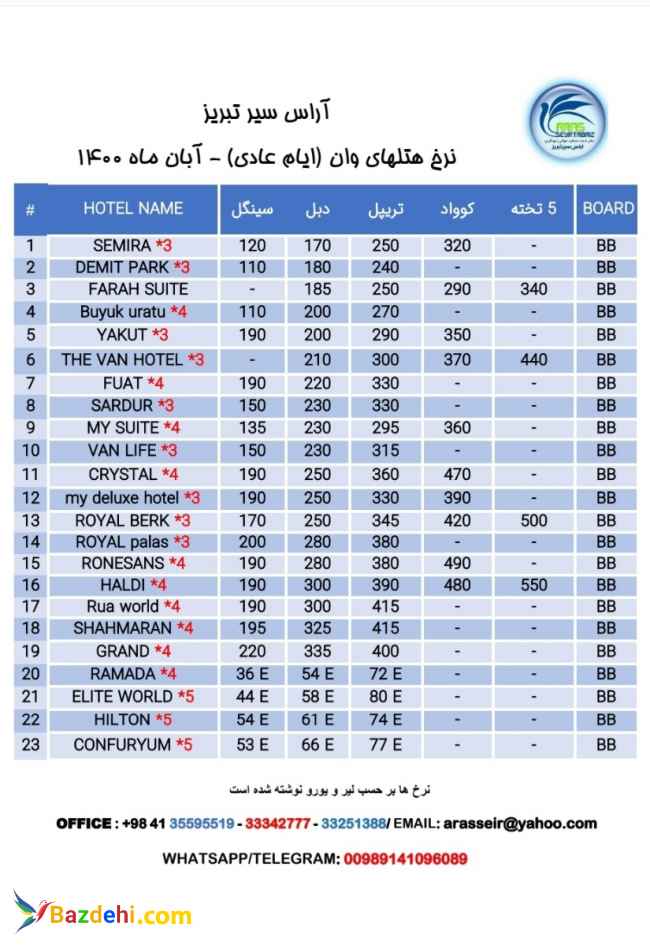 رزرو هتل های وان آراس سیر تبریز مجری اصلی تورهای وان میباشد و دارای نمایندگی رزرو هتل های وان است. شما هر هتلی را بخواهید فقط با یه تماس برای شما رزرو میکنیم با بهترین قیمت ممکن و با کمترین زمان ممکن برای اطلاعات بیشتر تماس بگیرید. شعار ما راحتی اطمینان خاطر و امنیت بالای برای شماست. در صورت تقاضای تور ، هزینه ترنسفر و بیمه مسافرتی بر مبلغ هتل اضافه خواهد شد. انقضای پاسپورت حداقل شش ماه میباشد. خدمات تور شامل: ترنسفر رفت و برگشت با ون ترک ، بیمه مسافرتی ، اقامت در هتل با صبحانه و اینترنت رایگان میباشد. با ما اعتماد ، اطمینان و راحتی را تجربه کنید.
