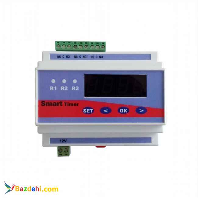 ابعاد : 12.5X8.5X5 نمایشگر : 7segment تعداد ورودی : 0 تعداد خروجی : 3 عدد خروجی رله 7 آمپر تغذیه : 12 ولت 1A - DC گارانتی : یک سال گارانتی و خدمات پس از فروش 10 ساله خلاصه عملکرد : این دستگاه دارای 3 عدد خروجی رله و یک ساعت دارای باتری داخلی میباشد، که برای هر کدام از رله ها میتوان تعداد 34 سیکل خاموش و روشن شدن و همچنین انتخاب روز هایی که می خواهیم تایمر در آن روزها عمل کند تنظیم نمود، به عنوان مثال رله اول در روزهای تعیین شده ساعت 12:00 روشن و ساعت 13:12 خاموش گردد. و برای رله دوم ساعت 1:15 روشن و 15:30 خاموش گردد. و همچنین برای رله سوم .