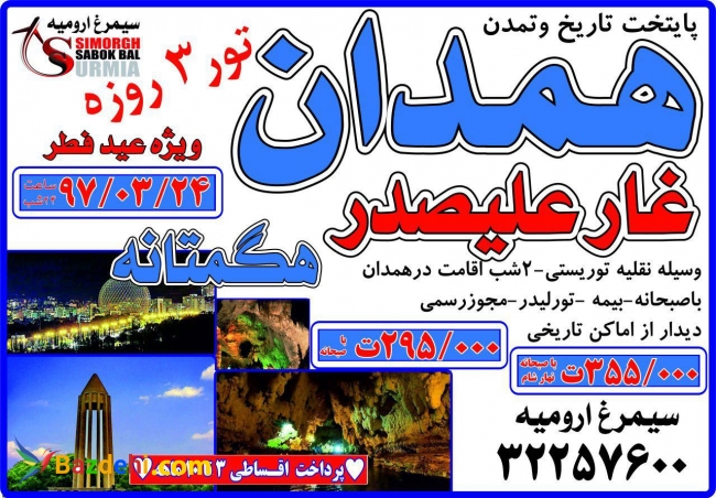 تور سه روزه غار علیصدر همدان(یکی از بقزرگترین غارهای جهان) ویژه عیدفطر حرکت:2 شب اقامت در همدان با صبحانه وسیله نقلیه توریستی،بیمه و تورلیدر