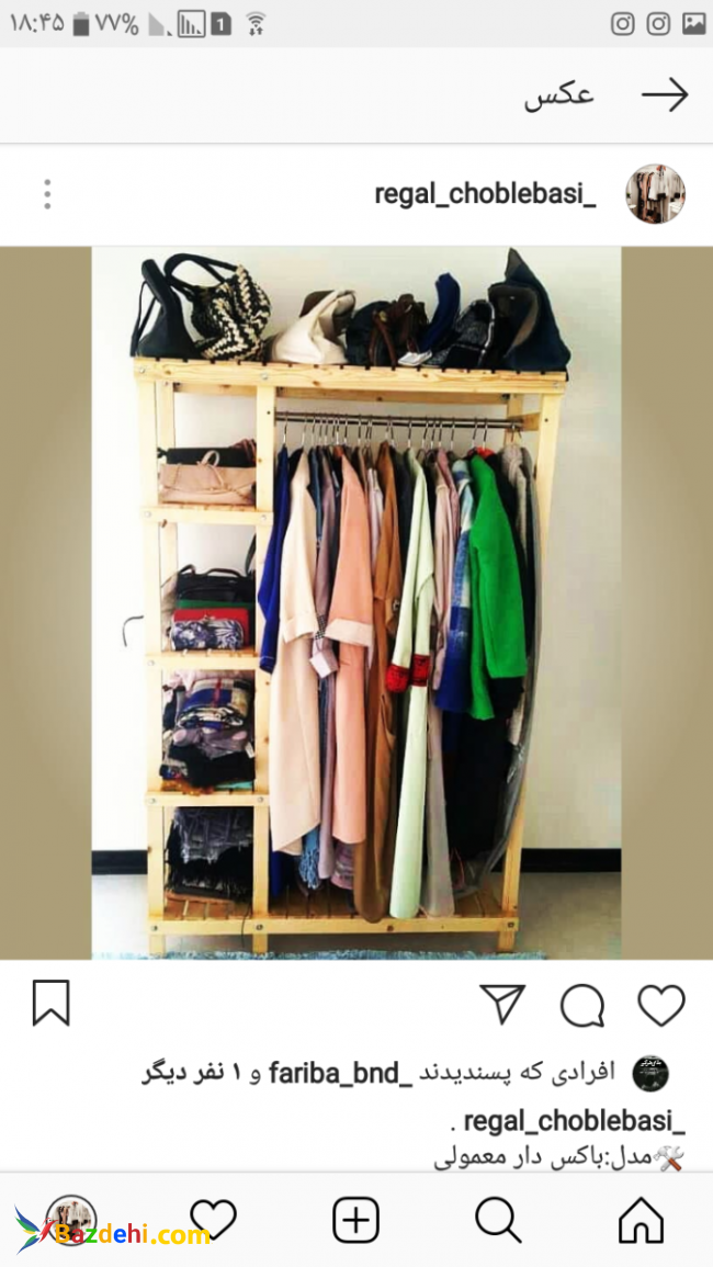 رگال مدرن رگال چوبی ایستاده بدنه چوب روسی درجه یک داری تحمل وزن بالا برای آویزان کردن تمامی لباس های شما عزیزان و همچنین طبقاتی برای قرار گرفتن کیف و کفش قابل استفاده برای منازل،فروشگاه ها،آرایشگاه ها،مزون ها و... باکس دار معمولی رنگ خام چوب و فندوقی   طول: 110سانتی متر قد: 170 سانتی متر عمق: 45 سانتی متر قیمت: 479 تومان یک طبقه رنگ خام چوبی و فندوقی طول:  100 سانتی متر قد:  170 سانتی متر عمق: 45 سانتی متر قیمت: 329 تومان یک طبقه سفید طول: 100 سانتی متر قد: 150 سانتی متر عمق: 45 سانتی متر قیمت: 429 تومان دو طبقه رنگ خام چوب و فندوقی طول:  100 سانتی متر قد: 170 سانتی متر عمق: 45 سانتی متر قیمت: 379 تومان قیچی،خام چوب و قهوه ای سوخته طول: 80 سانتی متر قد: 160 سانتی متر عمق: 45 سانتی متر قیمت: 379 تومان باکس دار ویژه خام چوب طول: 110 سانتی متر قد:  170 سانتی متر عمق: 45 سانتی متر قیمت: 529 تومان  امکان تغییر رنگ در 5 تم متفاوت ارسال در تهران و اسلام شهر و شهر ری (نصب شده) بصورت رایگان ارسال ب شهر های نزدیک مثل کرج( نصب شده ) هزینه ارسال بعهده مشتری حدود به40هزار تومن ارسال ب شهرستان (نصب نشده)(نصب آن بسیار آسان میباشد) توسط تیباکس و هزینه آن درب منزل پرداخت میشود شهرستانی های عزیز به علت پرداخت هزینه تیباکس برای شما عزیزان تخفیفات ویژه داریم بعلاوه کسانی ک بیش از یک خرید سفارش بدهند تمامی عکس ها در شیپور قرار نگرفته اند لطفا با پیام به شماره زیر عکس ها را با کیفیت دریافت کنید. جهت سفارش پیام کوتاه ب شماره ی 09927825272